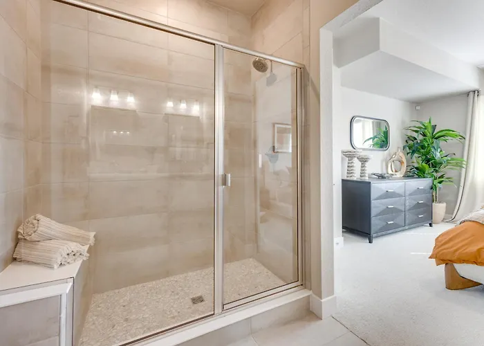 Elevated Home In North Colorado Springs With Patio includes a bathroom with a shower and a washing machine.